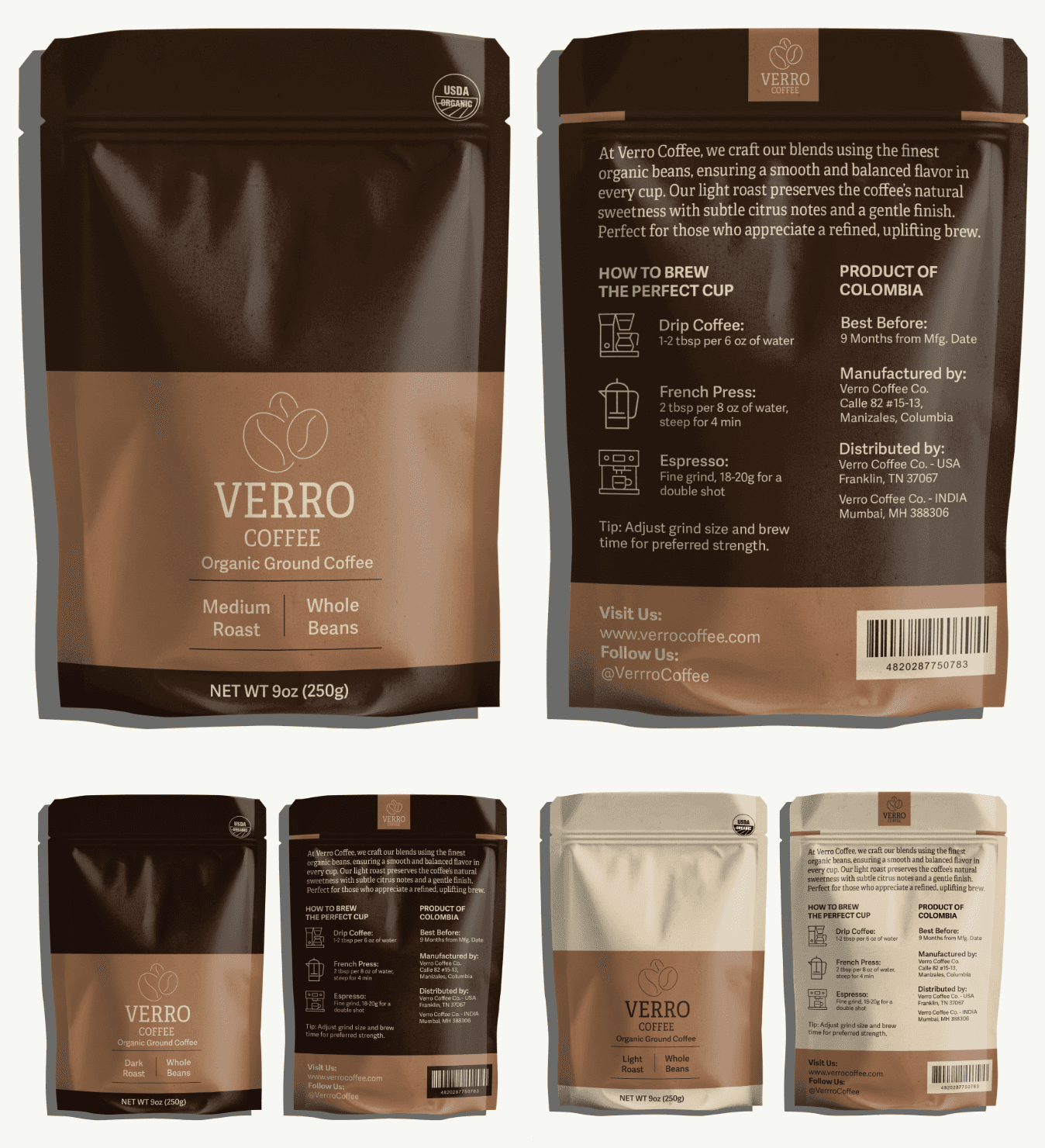 Verro Coffee is a premium fine-grind coffee brand crafted for everyday drinkers who value quality, warmth, and beautifully designed packaging. Its identity features a combination mark a clean line-art illustration of coffee beans paired with a bold serif wordmark symbolizing authenticity, craftsmanship, and the natural richness of freshly ground beans. The earthy brown palette reflects grounding warmth and the organic character of coffee itself. Verro offers three carefully curated variants Light Roast, Medium Roast, and Dark Roast each designed to suit different taste preferences. Together, the identity and product line express Verro’s mission: delivering high-quality, finely ground coffee in modern, premium packaging that elevates daily rituals for coffee lovers of all ages.